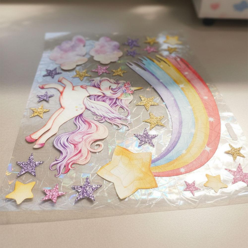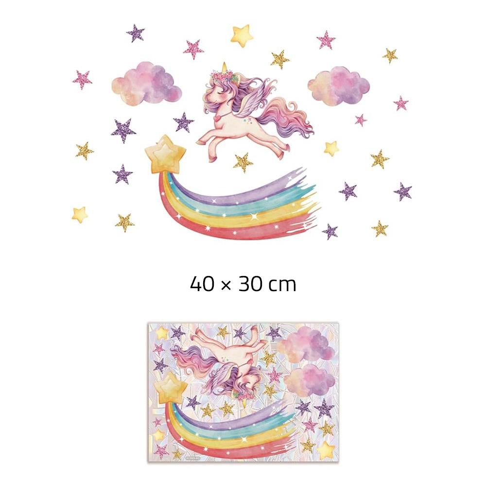 Dětská okenní samolepka s motivem jednorožce promění obyčejné okno v kouzelnou dekoraci plnou fantazie. Na archu najdete roztomilého jednorožce, duhu, hvězdičky i obláčky, které si můžete poskládat do vlastní veselé kompozice.Samolepka je přilnavá a neobsahuje lepidlo, takže ji jednoduše umístíte na hladké sklo a kdykoliv ji zase sundáte bez zbytků. Největší parádu udělá ve chvíli, kdy na ni zasvítí slunce – vytváří duhové odlesky, které krásně prozáří pokoj a dodají mu hravou atmosféru. Skvělá volba do dětského pokoje nebo pro všechny malé milovníky jednorožců.