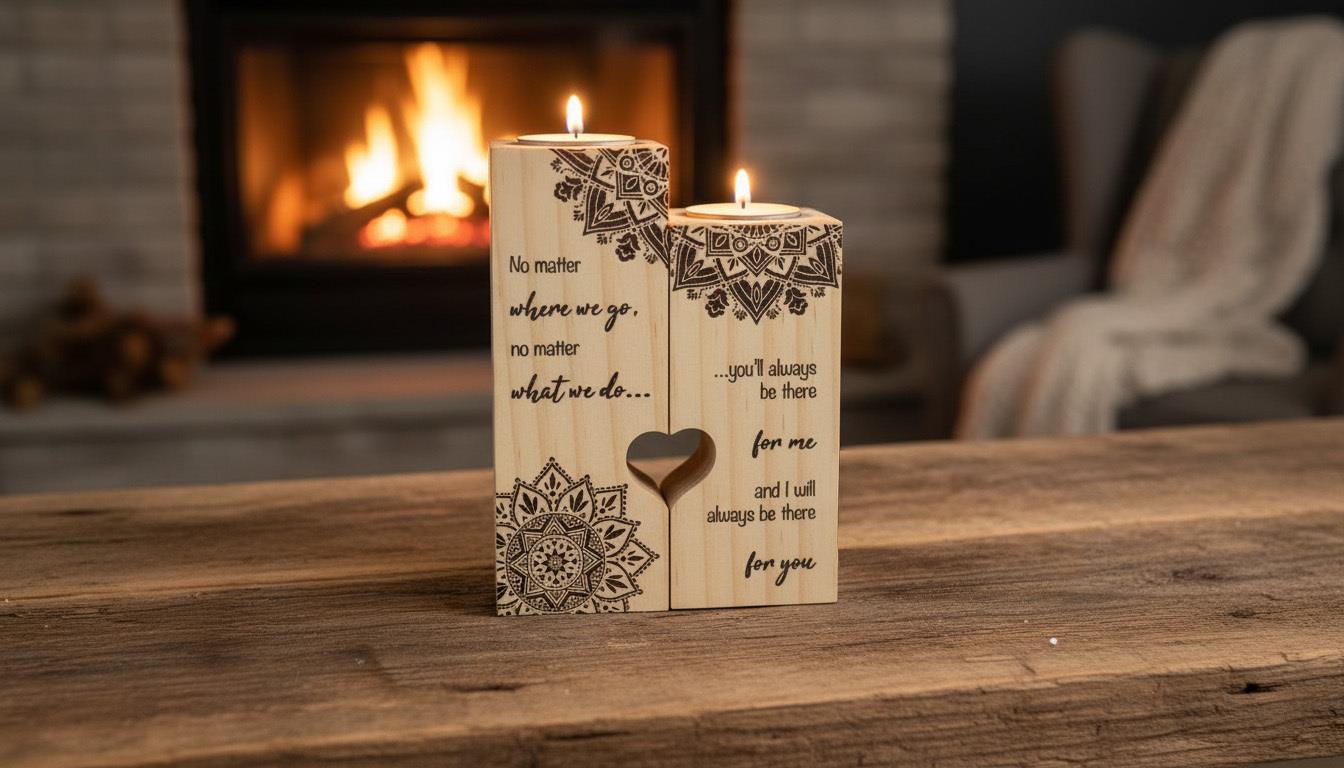 Dřevěné svícny na čajové svíčky pro páry jsou víc než jen stylovou dekorací – jsou symbolem vztahu, blízkosti a společných okamžiků. Set tvoří dva svícny rozdílné výšky, které k sobě patří stejně jako dva lidé spojení láskou i přátelstvím. Jemné gravírované motivy a texty dodávají svícnům osobní význam a hloubku.