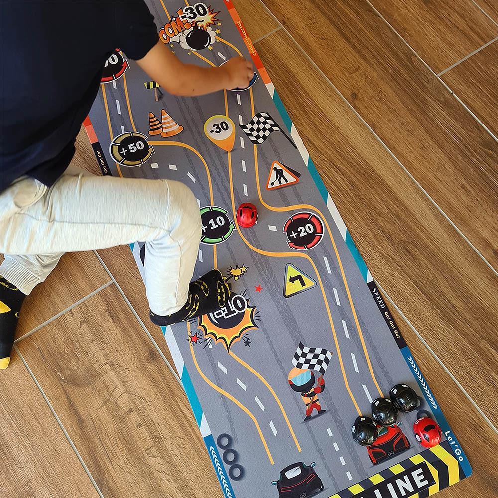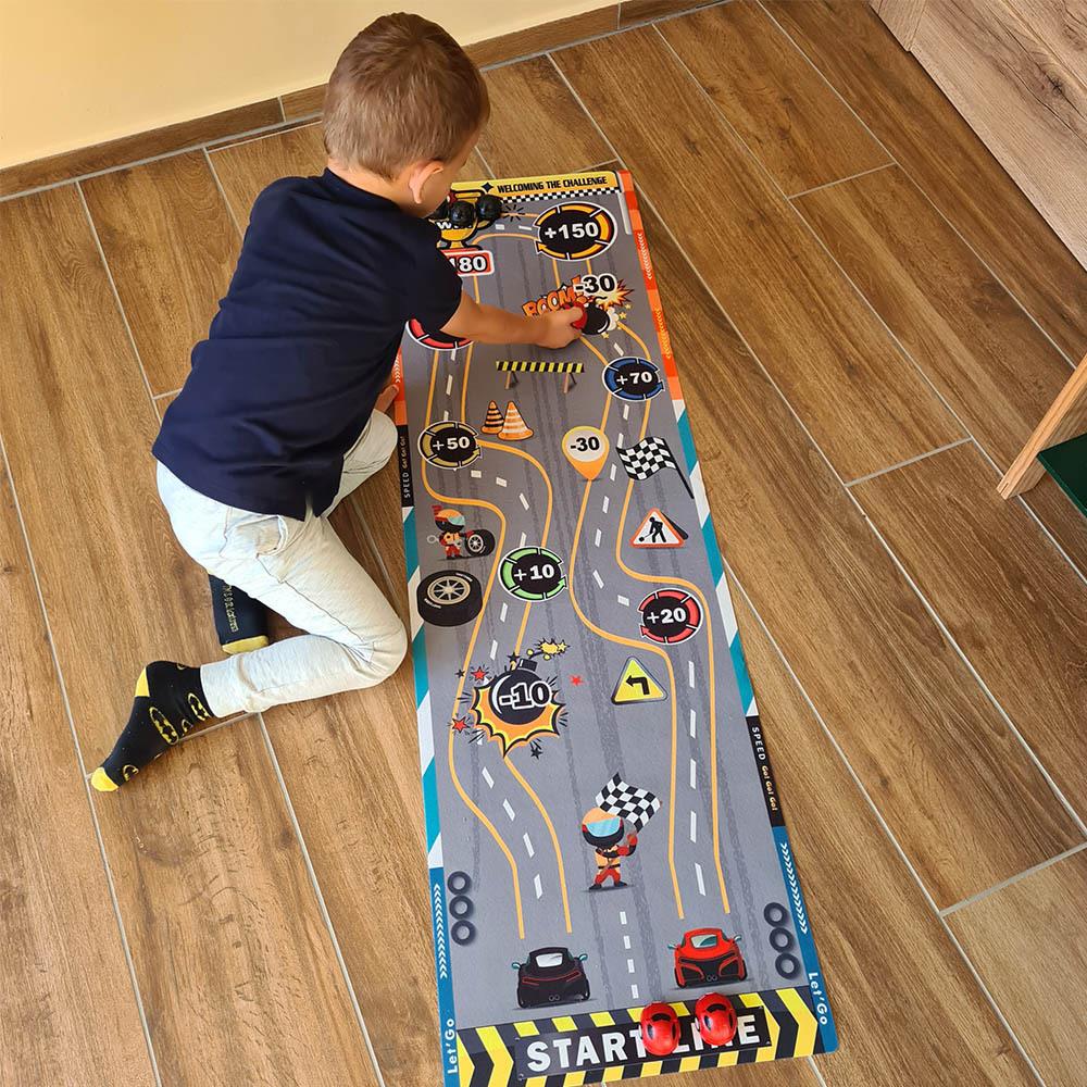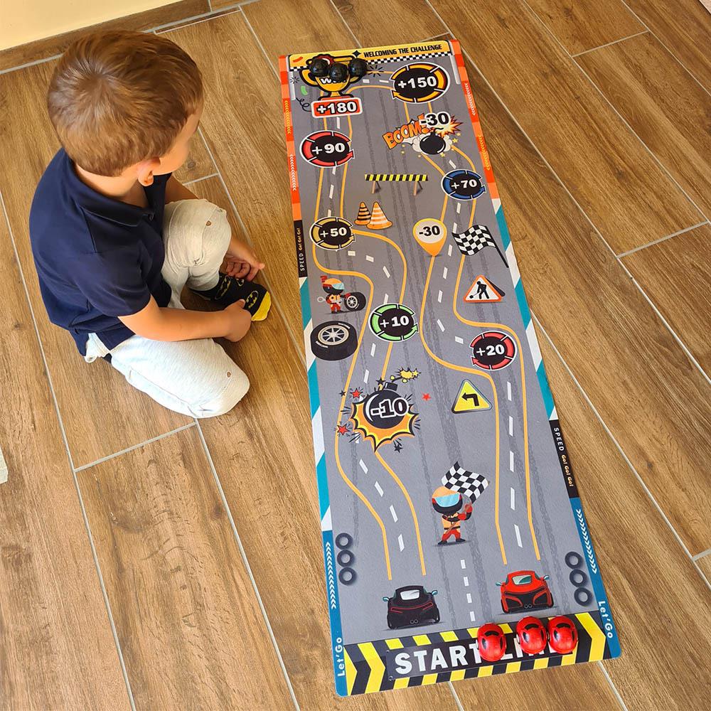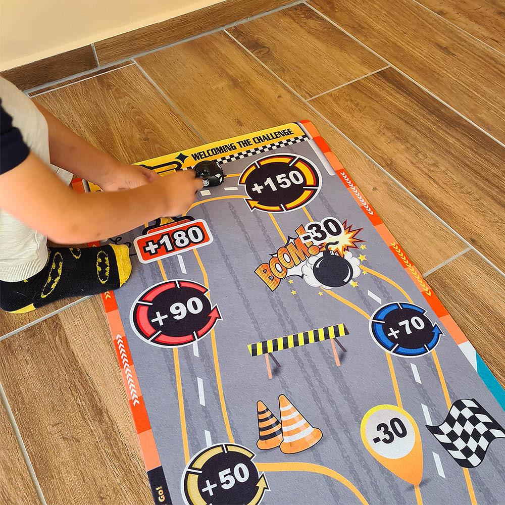 Tato zábavná herní podložka přinese do jakékoli místnosti vzrušující atmosféru. Děti si vyzkoušejí své střelecké schopnosti, nasbírají body a užijí si zábavu s touto jednoduchou, ale návykovou hrou. Stačí rozložit podložku, připravit "puky" a strefovat se do bodových zón. Díky měkkému materiálu je podložka snadno skladovatelná a lehce přenosná, což umožňuje její použití na dovolené, výletech nebo u přátel. Vyzkoušejte hru připomínající curling na dětské párty nebo během prázdninového pobytu. Kdo z vás ukáže, že má nejlepší "tah na branku" a nasbírá nejvíce bodů?