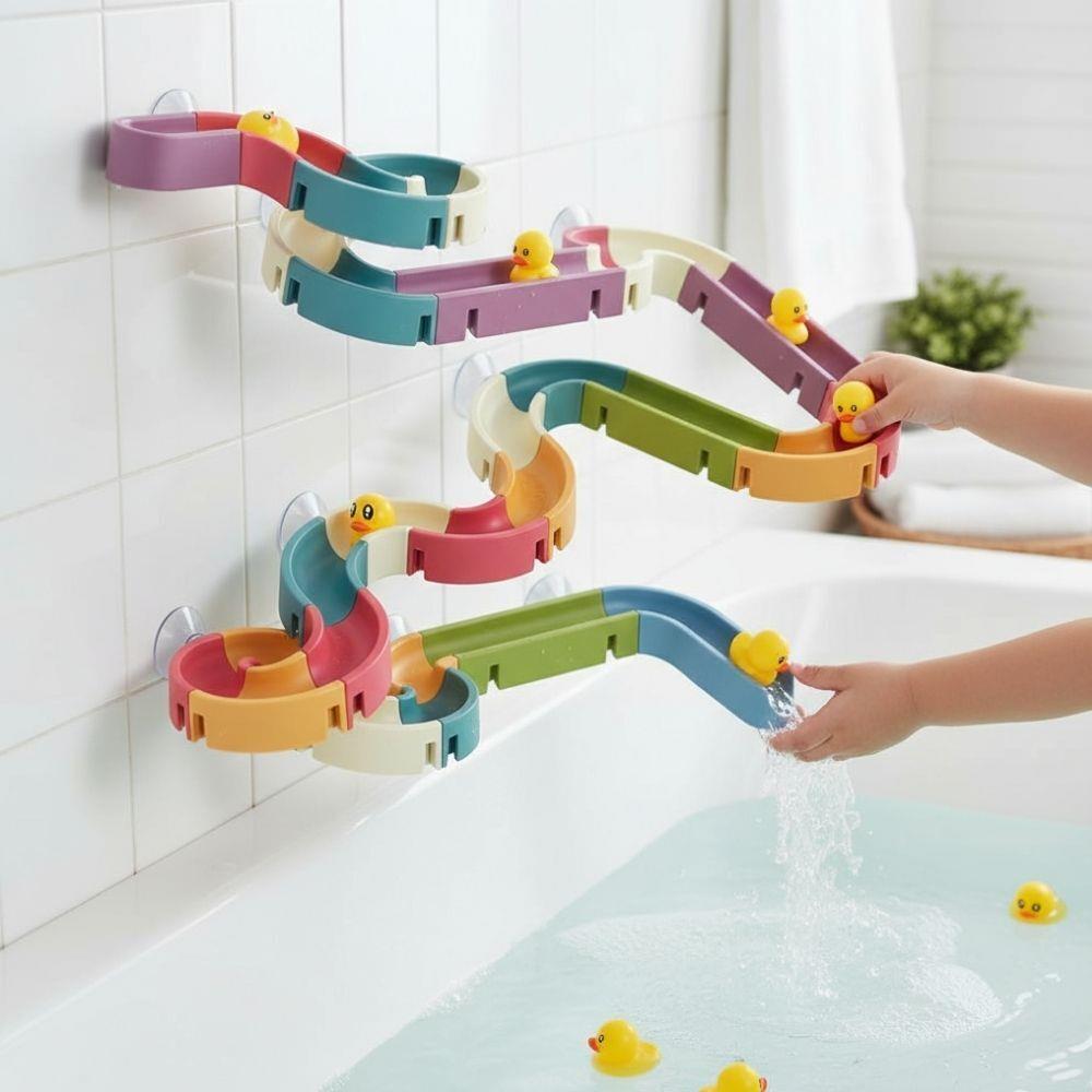 Postavte si tobogán pro kačenky přímo u vás doma! Skluzavka se skládá ze spousty dílků, které lze do sebe libovolně kombinovat. Děti si tak mohou zlepšovat představivost a fantazii. Díky přísavkám se snadno přichytí na obklad a stačí už jen připravit kačenky na start a závody mohou začít. 2 a více balení hračky lze na sebe napojit - vytvoříte parádně dlouhý tobogán.Večerní koupání už nebude jen nutností, ale zábavou. Ve vodě si děti s hračkou opravdu vyhrají. Jaká kačenka bude dole nejrychleji?