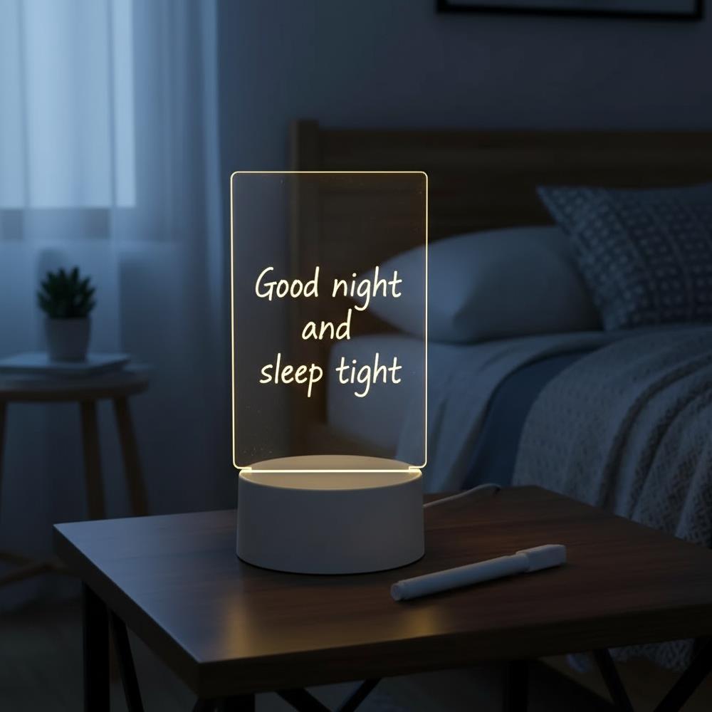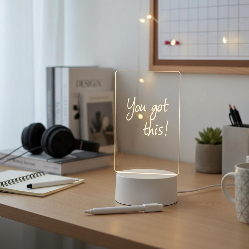 Vneste do své domácnosti nejen světlo, ale i originalitu se stolní lampičkou na vzkazy. Místo obyčejných lístečků či zpráv na lednici vám tato chytrá dekorace umožní jednoduše napsat jakýkoliv vzkaz přiloženým fixem přímo na lampičku – postačí ji rozsvítit a váš text krásně vynikne. Je ideální pro noční stolek, kde může přát hezké sny, nebo na pracovní stůl, kde vám připomene důležité úkoly. Když budete chtít napsat nový vzkaz, původní jednoduše setřete hadříkem – rychlé, snadné a navíc stylové. Lampička na vzkazy je skvělým způsobem, jak sdílet myšlenky, připomínky i vřelá slova, která nezapadnou v každodenním ruchu.
