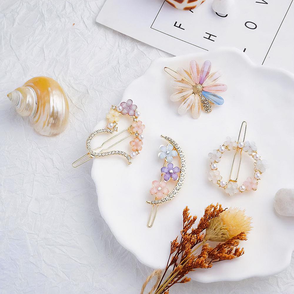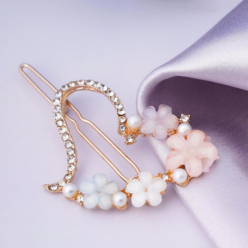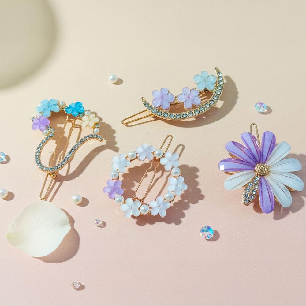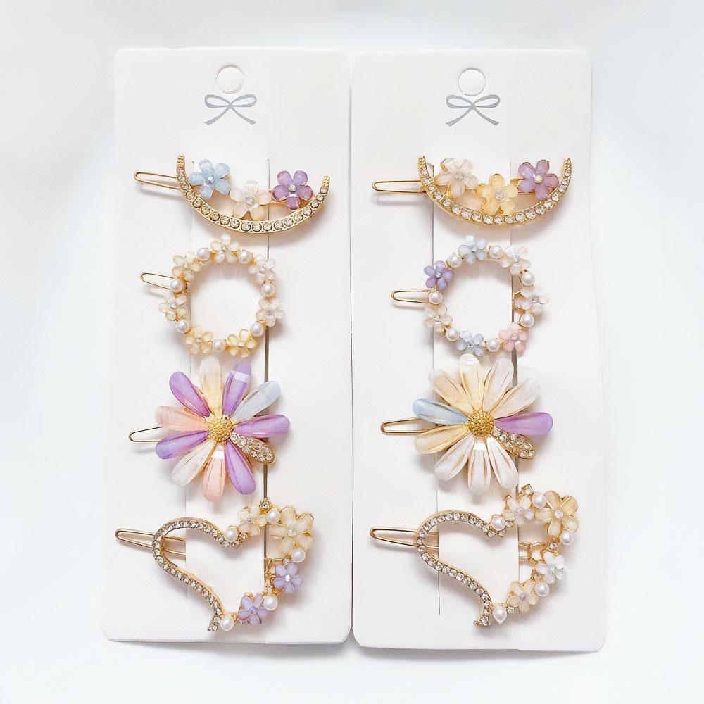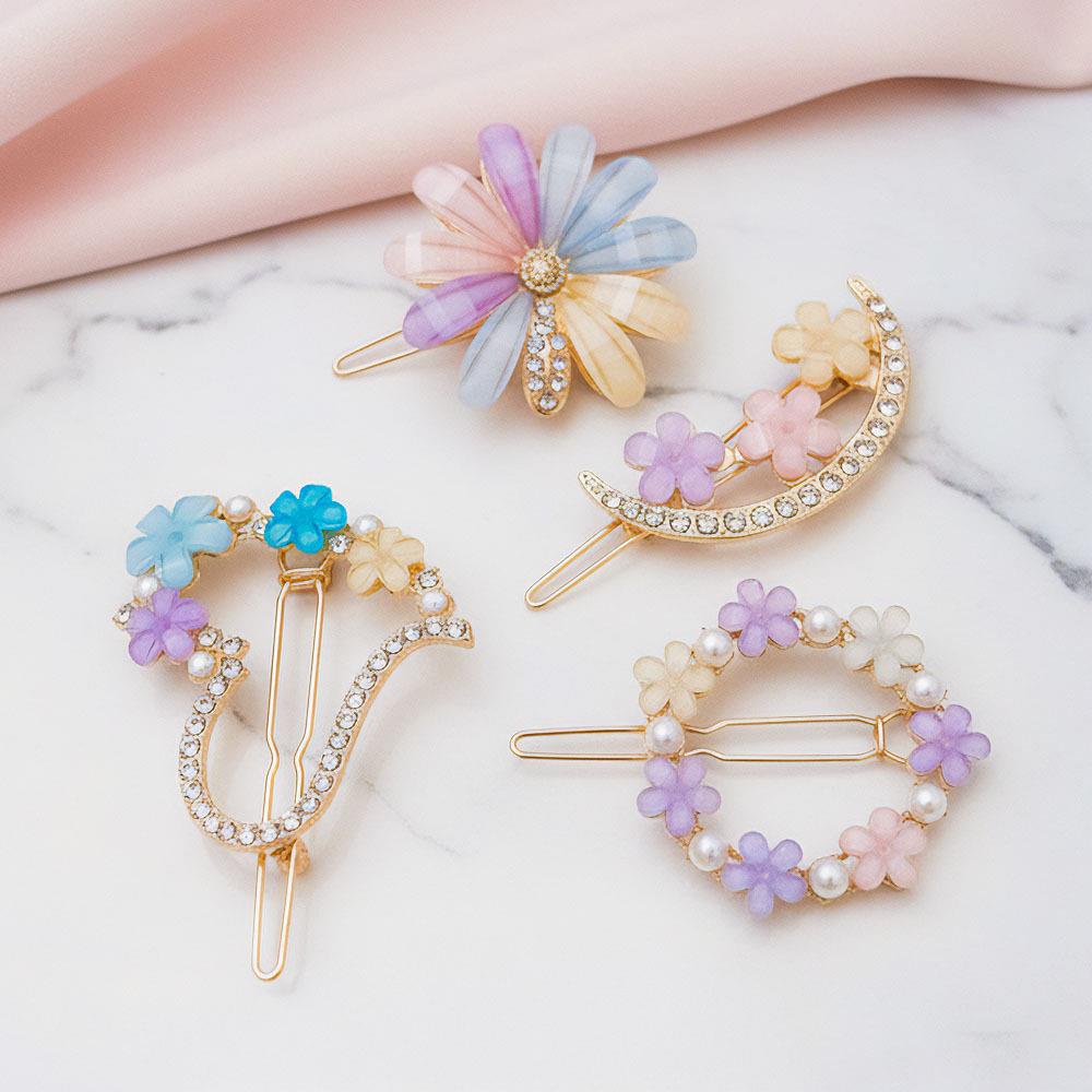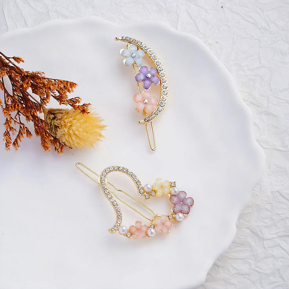Sada čtyř kytičkových sponek do vlasů s kamínky a perličkami je dokonalým doplňkem pro každou příležitost. Každý kousek má jiný design – od srdíčka přes měsíček až po květinový věneček či pastelovou sedmikrásku. Sponky jsou lehké, ale pevné, takže dobře drží ve všech vlasech. Lesklé kamínky a perličky odrážejí světlo a dodávají účesu romantický, elegantní nádech. Skvěle se hodí nejen na oslavy, svatby nebo focení, ale i pro každodenní nošení. Potěší malé i velké milovnice půvabu a detailu.