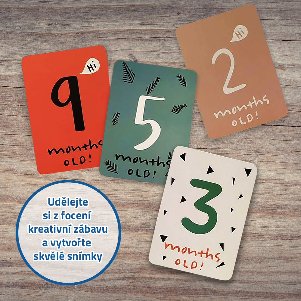 Zaznamenat krásné momenty z prvních měsíců vašeho miminka nebylo nikdy snažší. Milníkové kartičky stačí položit vedle děťátka a vyfotit. Zachytíte tak všechny krásné chvilky a napořád si budete pamatovat, jak rychle vám miminko rostlo a vyvýjelo se. Balení obsahuje 20 kartiček s hravým a barevným designem, který změní každý váš snímek v kreativní focení.