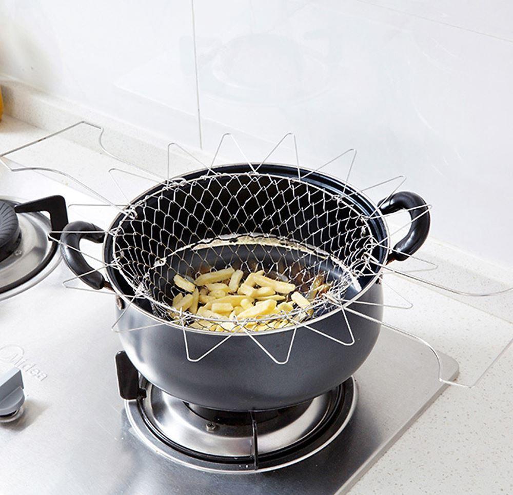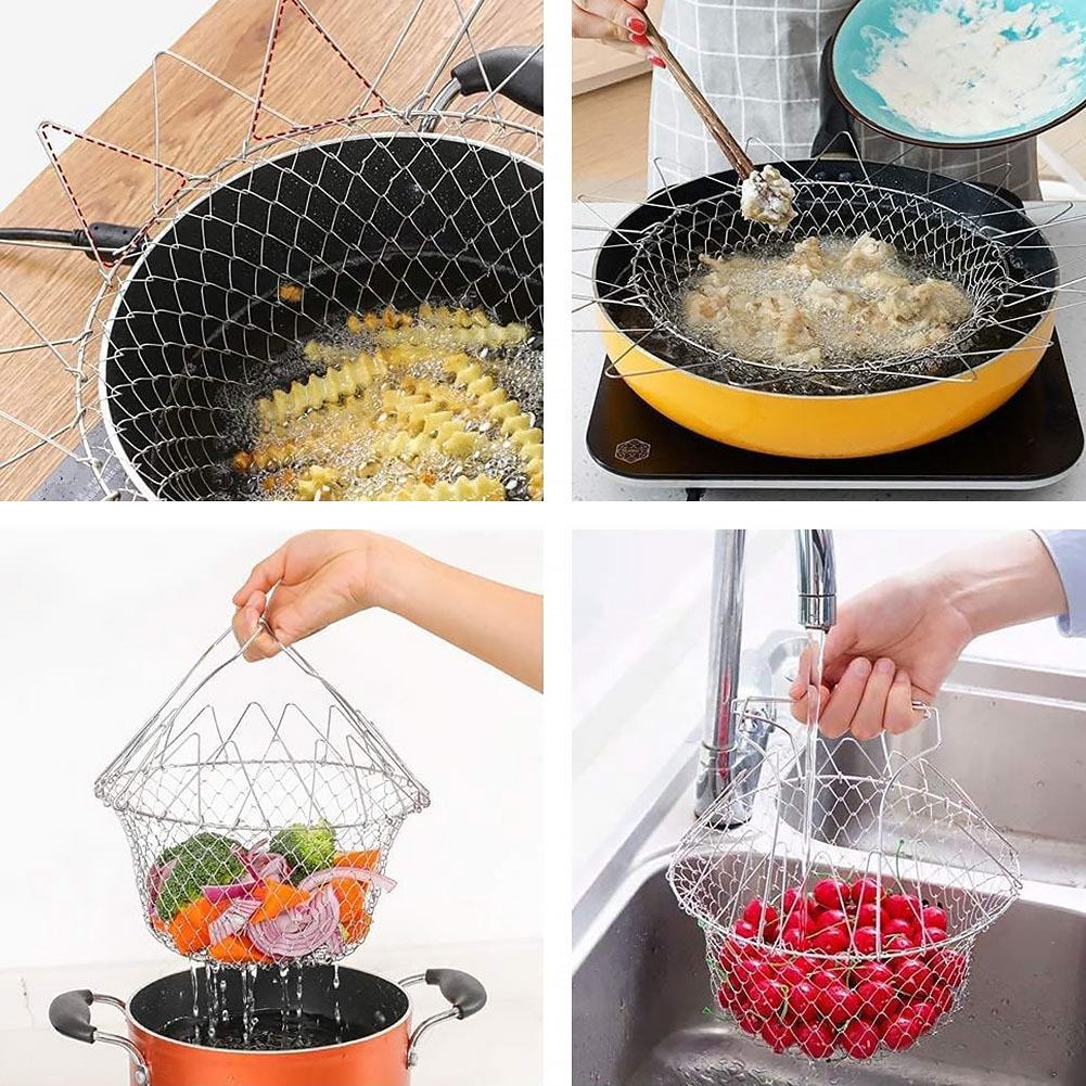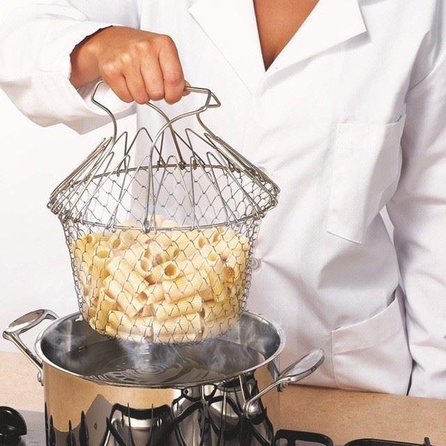 Kuchařský košík bude skvělou, a především praktickou pomůckou do každé kuchyně. Ať už v té profesionální kuchyni nebo u vás doma! Lze ho využívat na několik způsobů! Jako cedník na proplachování uvařených těstovin, dále jako mísu na ovoce či zeleninu, anebo k vaření na páře jako pařáček. Kuchařský košík se snadno skládá a rozkládá. Ve složeném stavu nezabírá skoro žádné místo. Využijete ho především k vaření těstovin či zeleniny nebo k vaření na páře. Poslouží vám také ke smažení. Případně ho můžete vystavit jako dekorační košík na omyté ovoce a zeleninu. Tip: Dobře známá situace! Vaříte těstoviny, po scezení však zjistíte, že jich máte málo! Co teď s tím? Postavit nový hrnec a opět čekat na var? To už se vám samozřejmě nechce! Doporučujeme vařit těstoviny v sítu a skvěle tak předejdete problému s dovařením! Uvařené těstoviny vyndáte v sítu, přesypete do jiného hrnce a v případě zjištění, že jich máte málo, je k stále k dispozici hrnec s horkou vodou!
