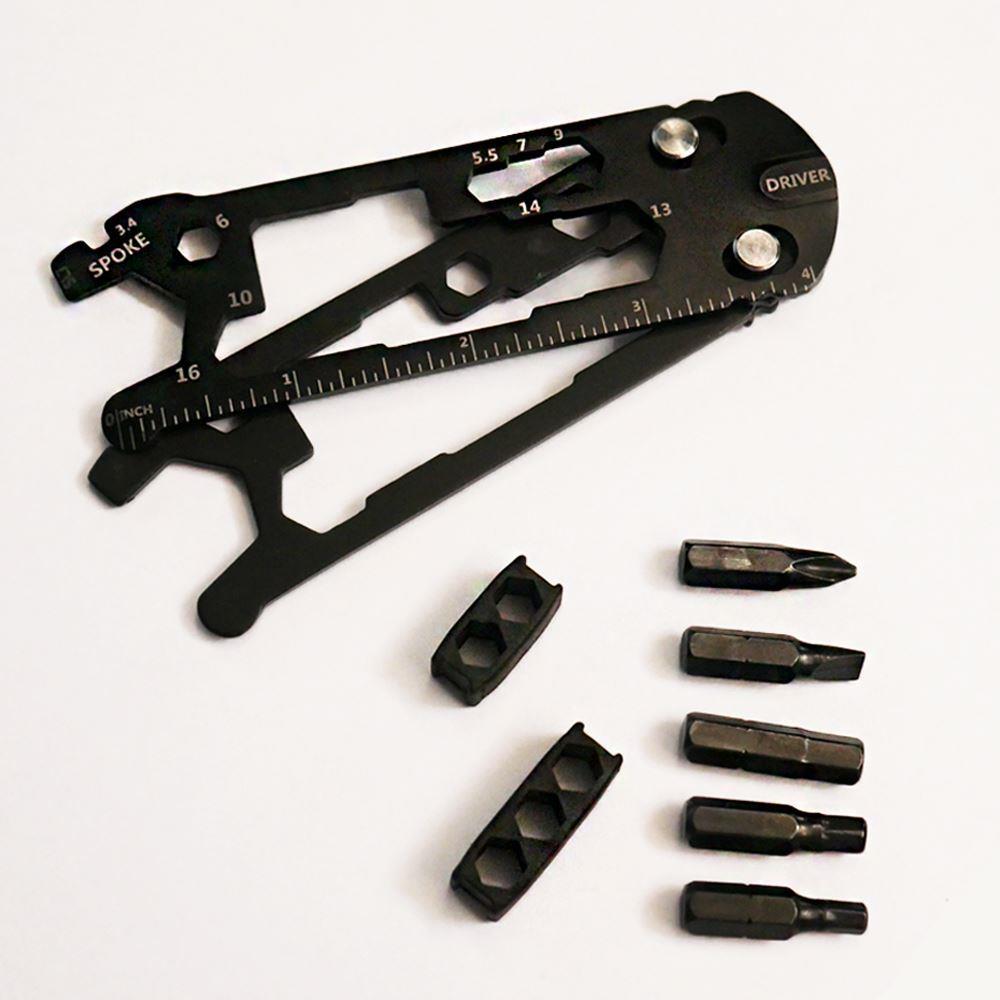 Multinástroj na kolo vám pomůže vyřešit jakýkoliv problém nejen při cestování na kole, ale i v domácnosti. Pokud byste potřebovali cokoliv utáhnout, povolit nebo upravit, pokaždé se vám bude hodit tento praktický multinástroj. Když budete potřebovat použít bity, vysuňte jeden zásobník s bity, vyndejte požadovaný bit a umístěte jej do otvoru s nápisem DRIVER. Pro vyvinutí větší síly vložte bit do otvoru označeného mozaikou. Pro snadnější práci je vhodné vždy nechat jeden zásobník s bity v nástroji. Pro použití klíčů vyjměte oba zásobníky s bity a multinástroj rozložte na dvě poloviny.