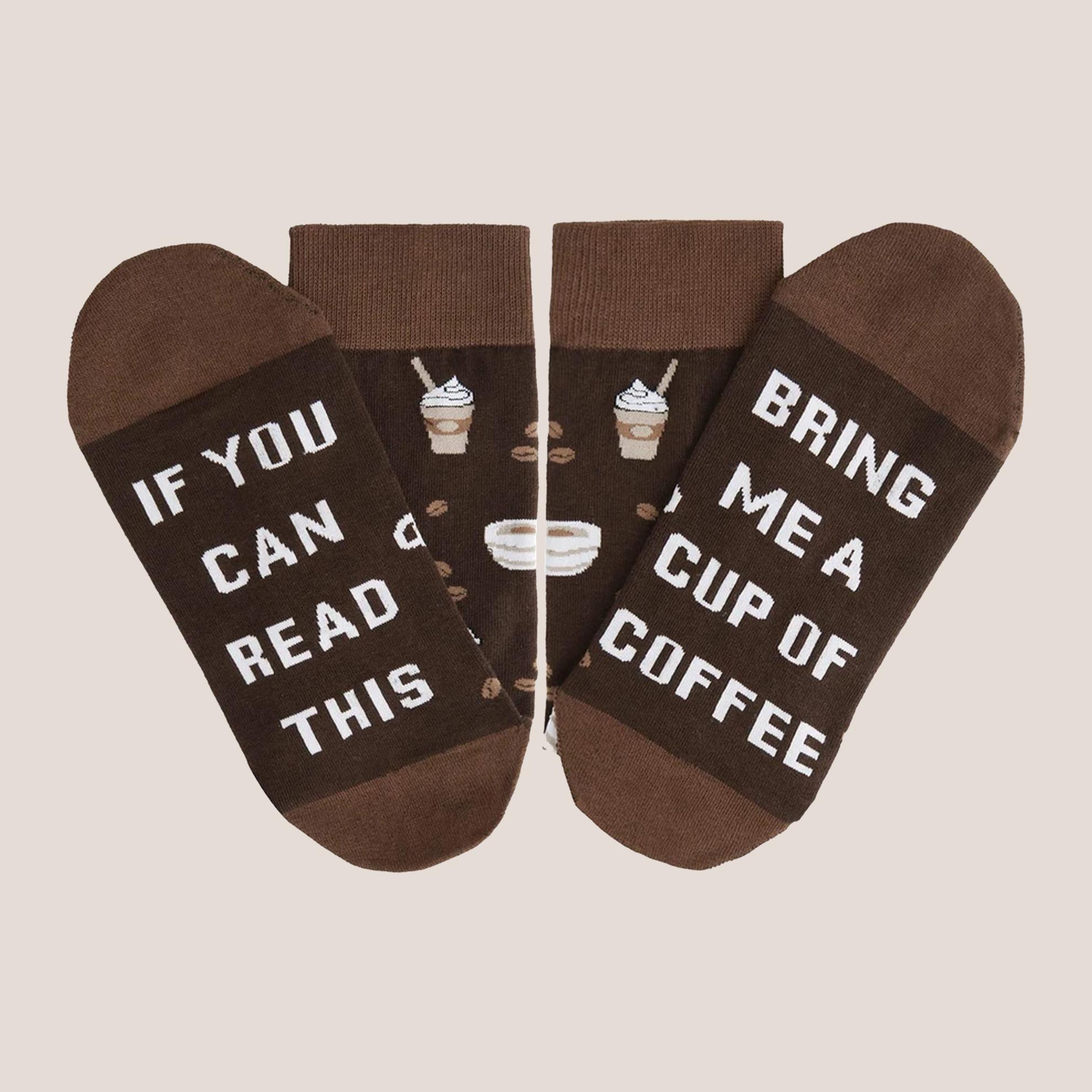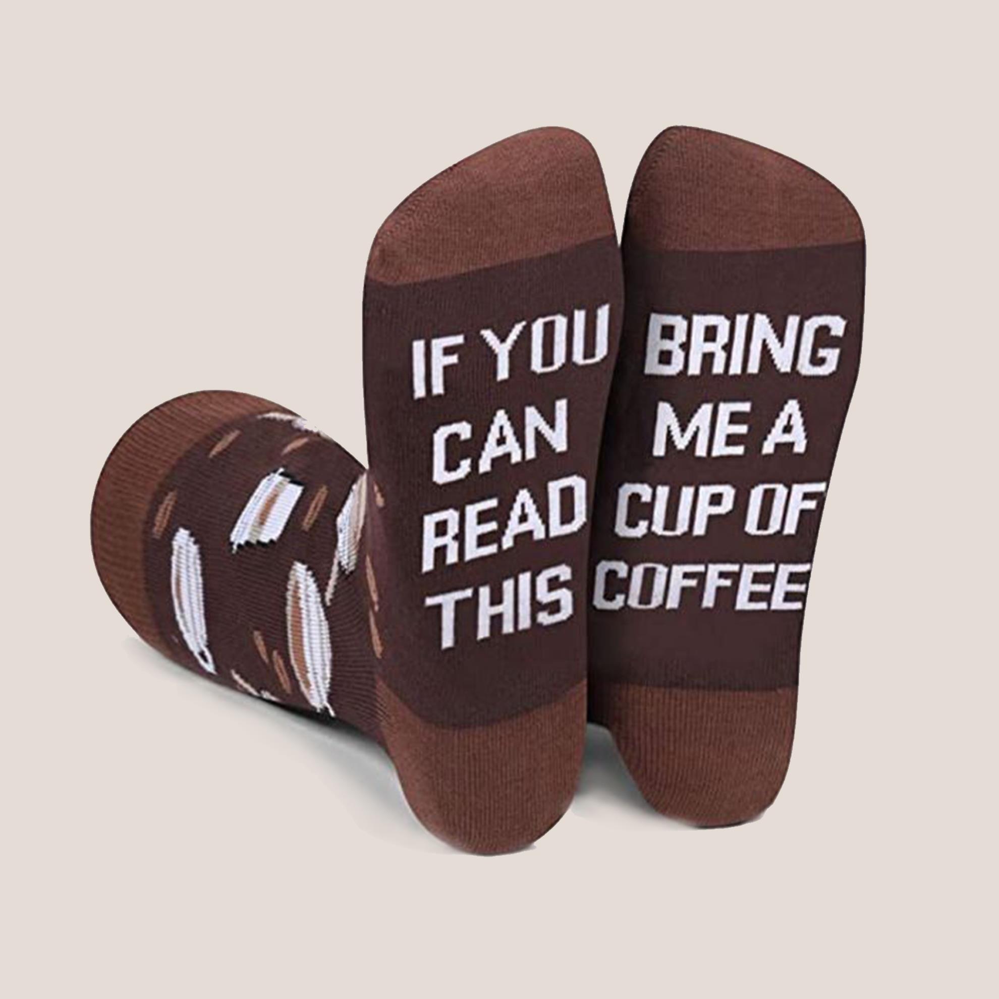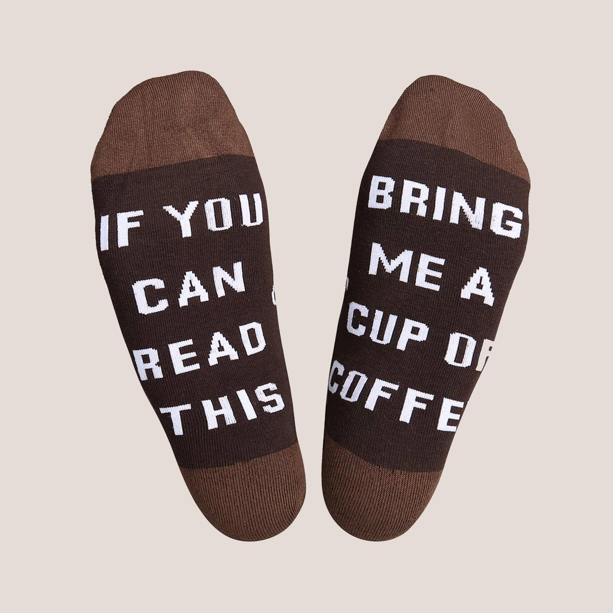 Kávové ponožky pro ty, kteří rádi posedí při pití kávy a mají smysl pro humor. Díky příjemnému materiálu, univerzální velikosti a jasnému poselství na jejich spodní straně, které vyjádří vaše přání beze slov, jsou tyto ponožky perfektním dárkem pro všechny příležitosti! Tyto zábavné ponožky dobře padnou jak ženám, tak mužům.