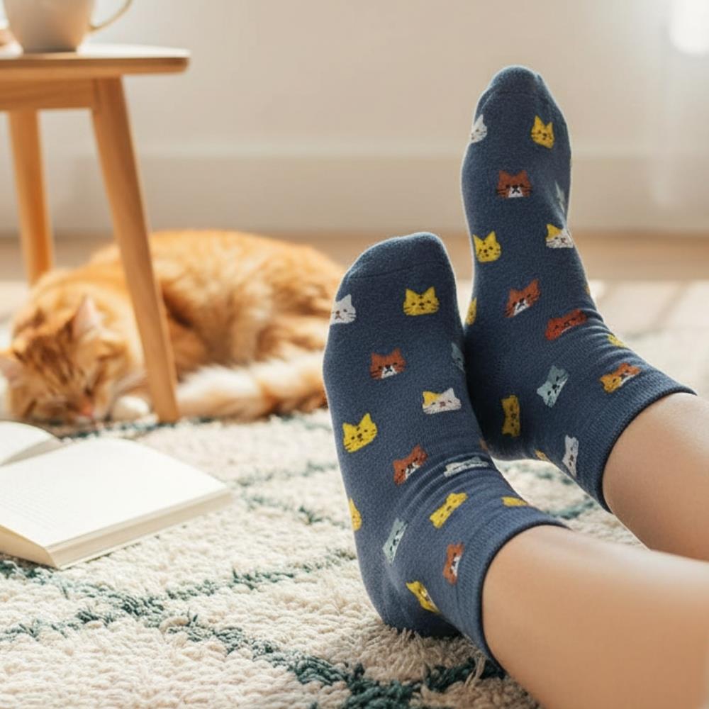 Hřejivé a stylové ponožky pro každý den Tyto veselé ponožky v nádherné modré barvě jsou skvělým módním doplňkem a dokonalým dárkem pro milovníky koček. Díky příjemnému materiálu ze 100% polyesteru udrží vaše nohy v teple a pohodlí po celý den. Univerzální velikost zajistí, že padnou téměř každému. Kvalitní provedení a trendy vzhled udělají parádu nejen doma, ale i venku. Pořiďte si ponožky, které zaručeně rozzáří váš každodenní outfit!