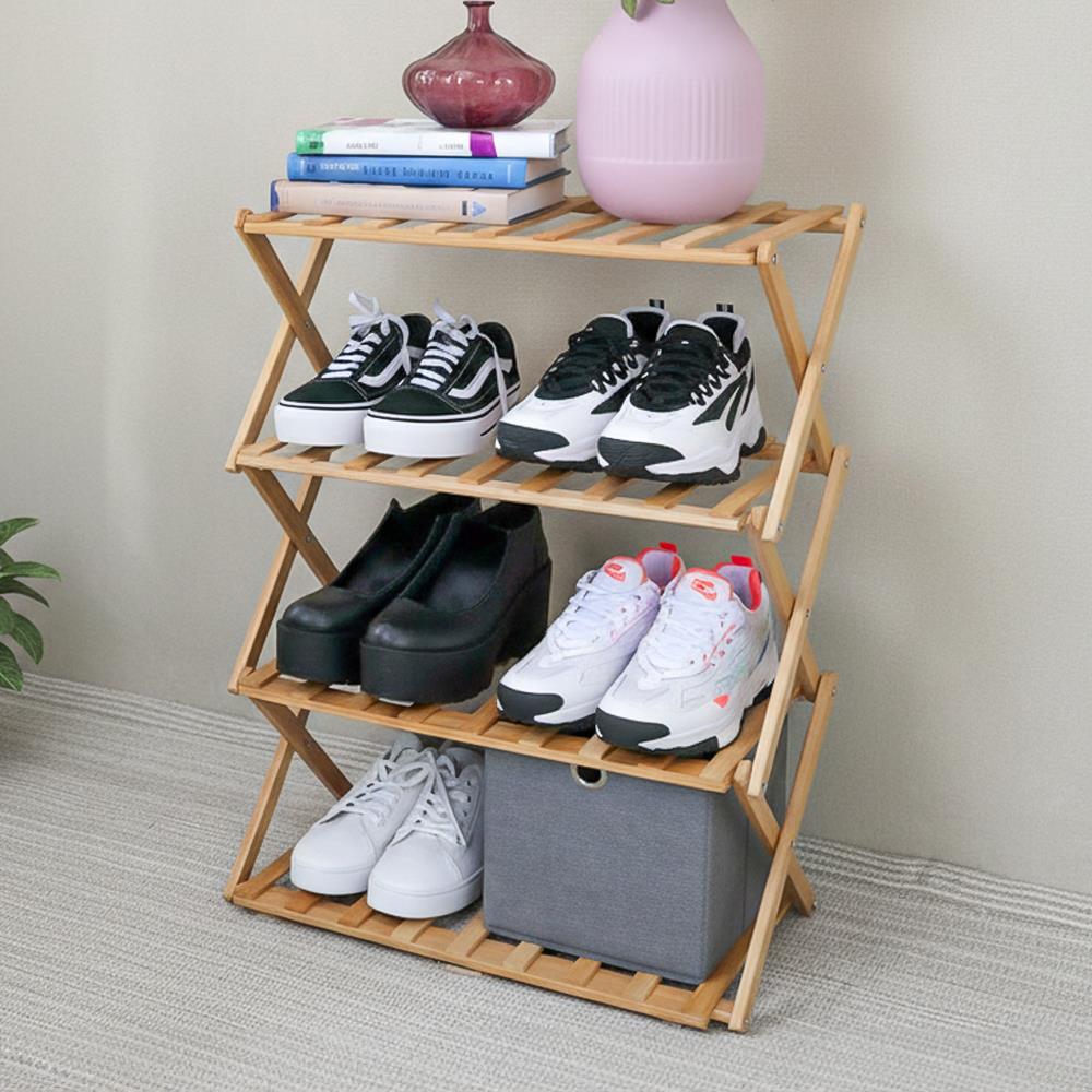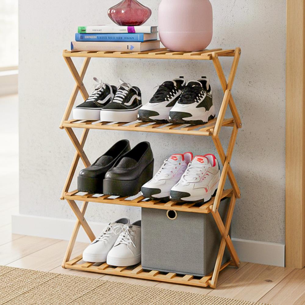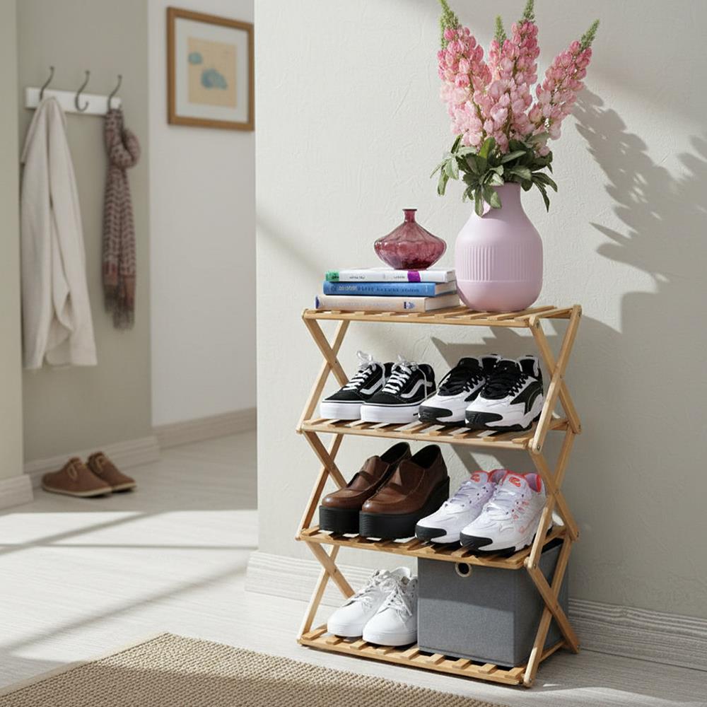 Originální skládací regál najde využití v každé domácnosti. Nemusí to být pouhý botník, postavený vedle vchodových dveří. Můžete si vyhrát s dekoracemi a ozdobit jej květinami, knihami a vytvořit tak příjemné prostředí třeba v obýváku. Dřevěný regál se 4 policemi můžete využít i v koupelně k uspořádání županů a ručníků.