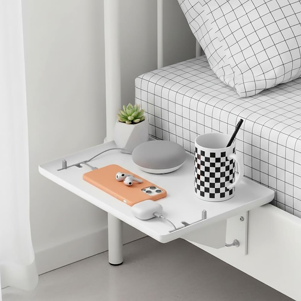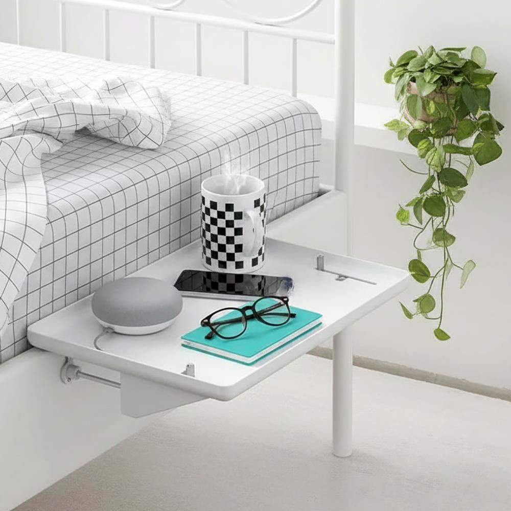 Noční stolky se s érou chytrých telefonů proměnily z místa, kam jsme před spaním odkládali hodinky, brýle či knížku v dobíjecí stanice okupované zamotanými kabely a bojujícími o každý volný centimetr. Často se tak stává, že nám věci padají na zem, nebo jich pár sami shodíme, když se ráno natahujeme po hlasitému zvuku budíku z telefonu. Pokud i vy bojujete s nedostatkem prostoru nebo si jen chcete okolí kde odpočíváte zorganizovat, máme pro vás tento praktický přídavný stolek, který jednoduše připevníte k rámu postele.