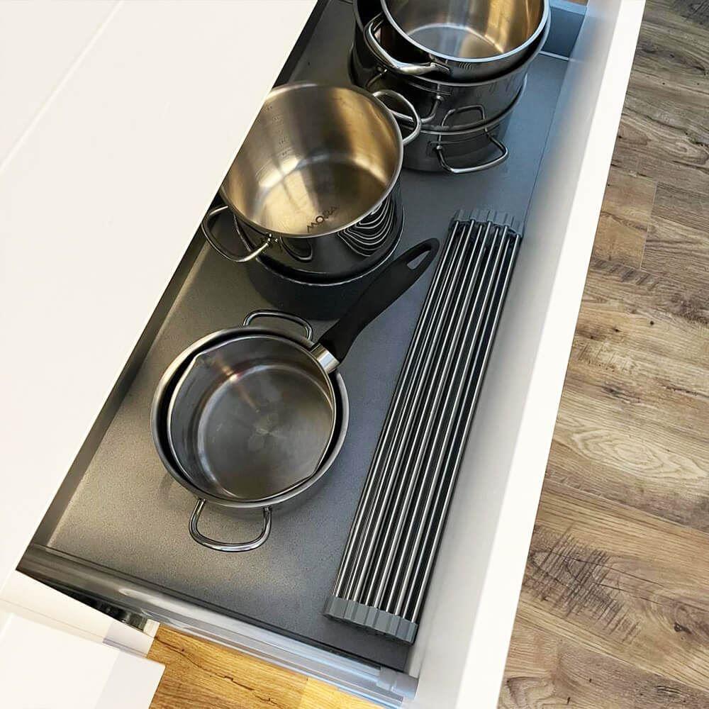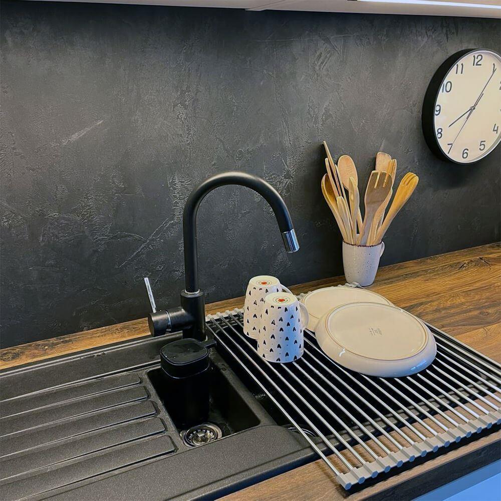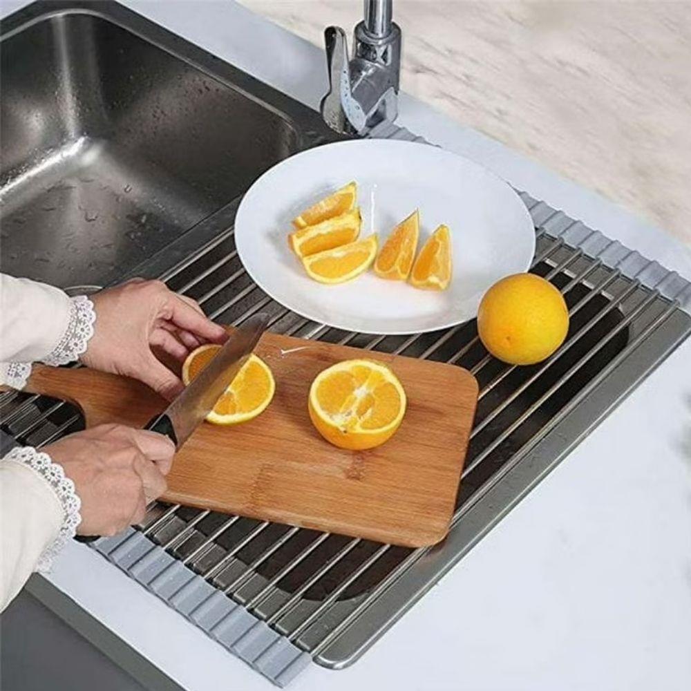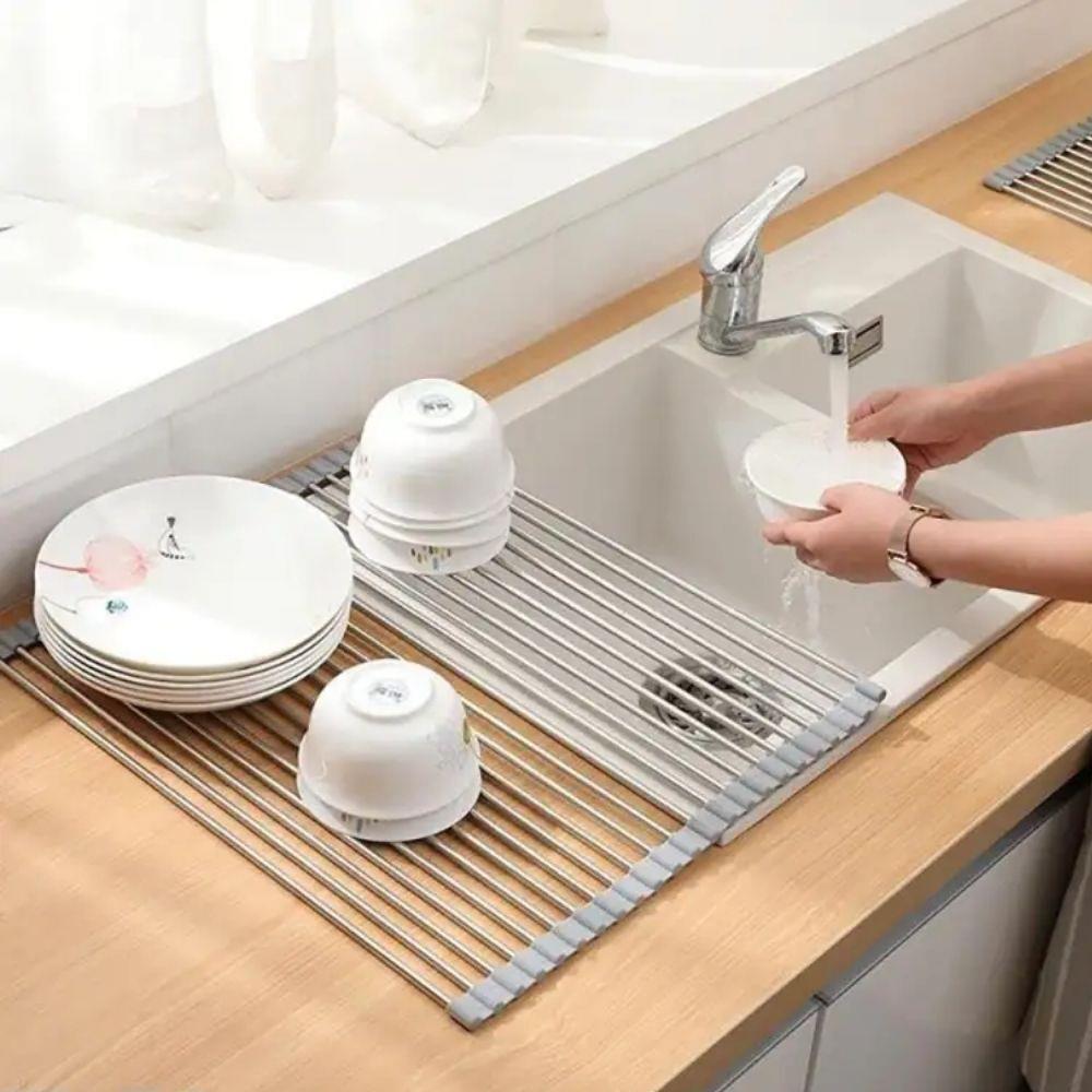 Rozkládání je jednoduché a nepotřebujete k tomu žádné nářadí a jiné pomůcky. Odkapávač jen rozbalte a položte na dřez. Odkapávač je vyrobený z kvalitního materiálu a na dřezu je stabilní. Unese i těžké hrnce. Pokud zrovna odkapávač nebudete používat, stačí ho srolovat do ruličky a umístit kamkoliv. Na lince nebo ve skříňce nezabere téměř žádné místo. Díky tomu, že je odkapávač tvořený z tyček, tak voda vždy steče do dřeze a nikde se nebude držet a třeba plesnivět.