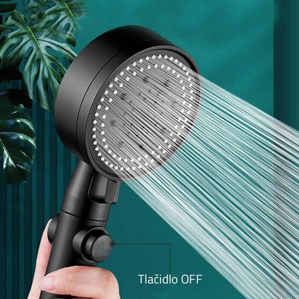Úsporná sprchová hlavice je praktický doplněk do každé koupelny. Hlavice se jednoduše zapíná pomocí tlačítka OFF. Nabízí celkem 5 různých typů proudění vody. Patří sem masážní proudění vody, mix, kapky deště, pulsující a rozprašovací proudění vody. Proudění vody se nastavuje pomocí malé páčky na točící části.