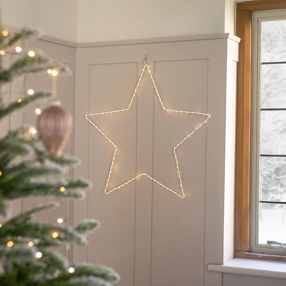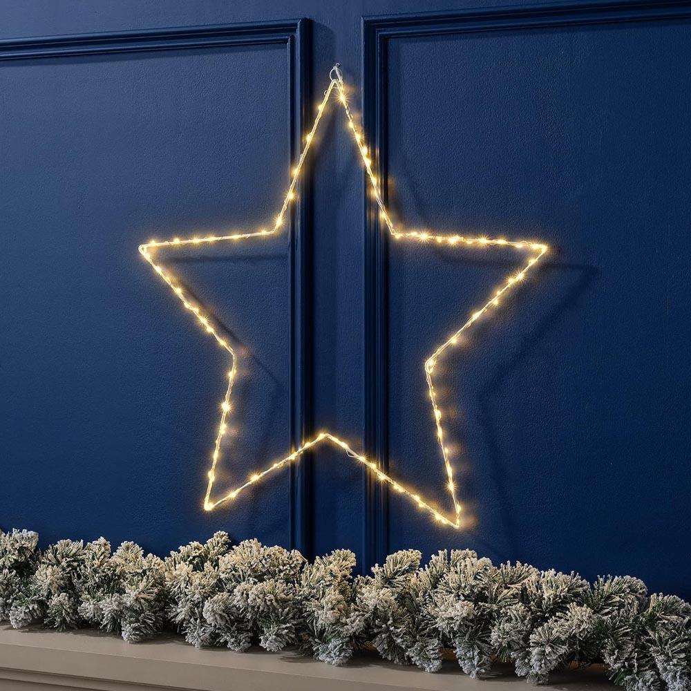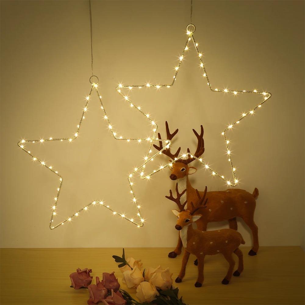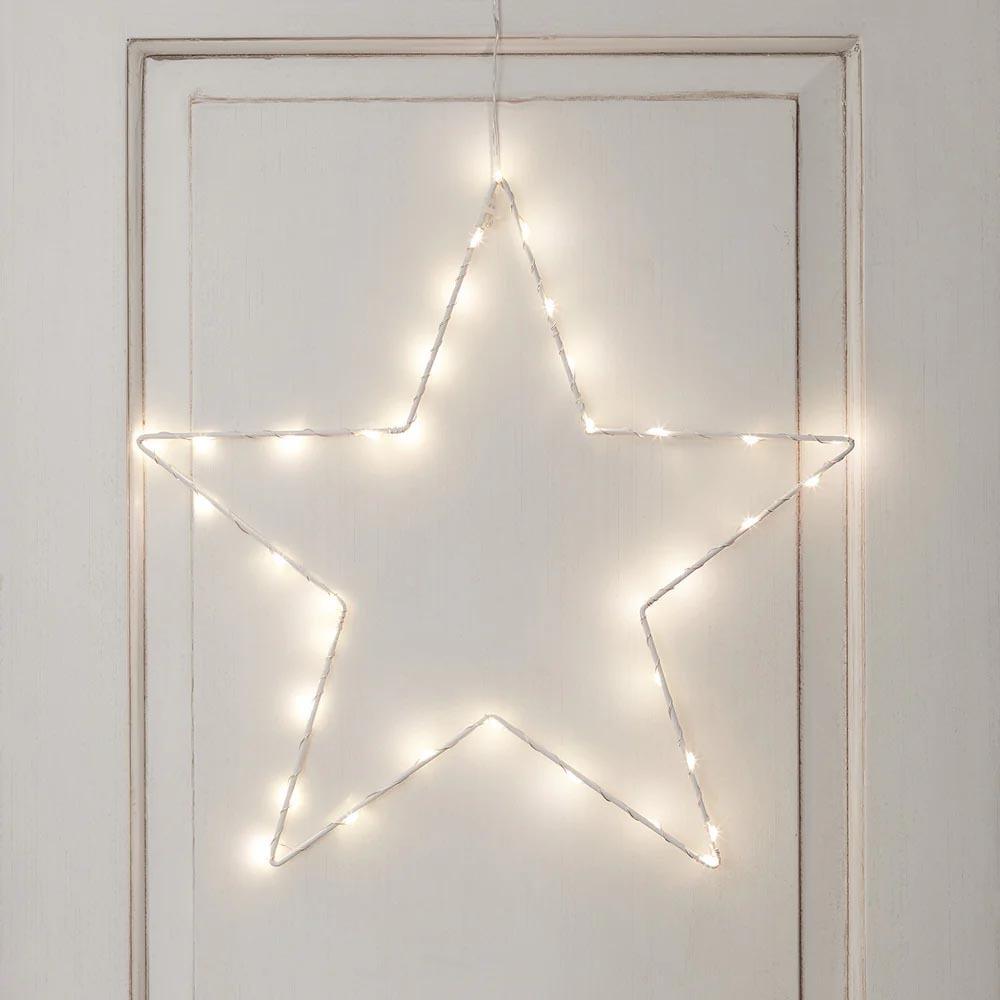 Stylová kovová struktura v podobě hvězdy Příjemné bílé LED osvětlení pro vytvoření pohodové nálady Perfektní k umístění na okno, stěnu nebo jako interiérová ozdoba Snadné zavěšení díky očku