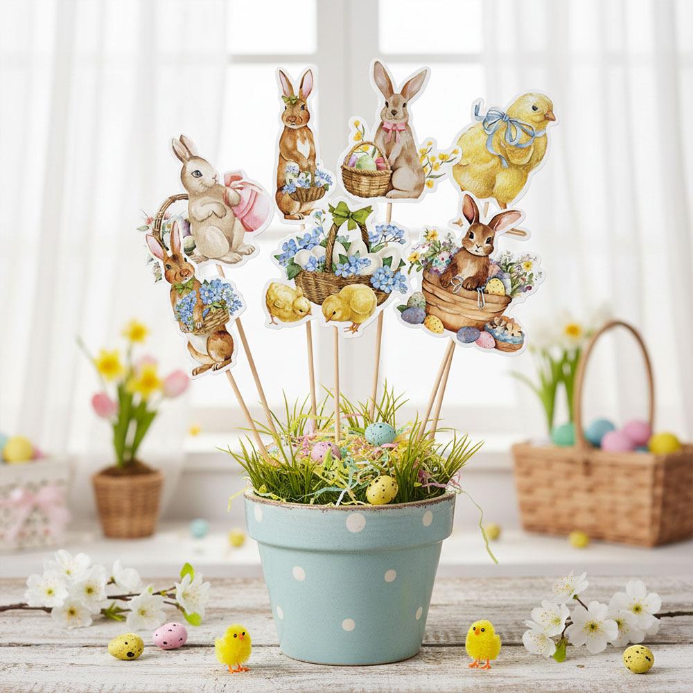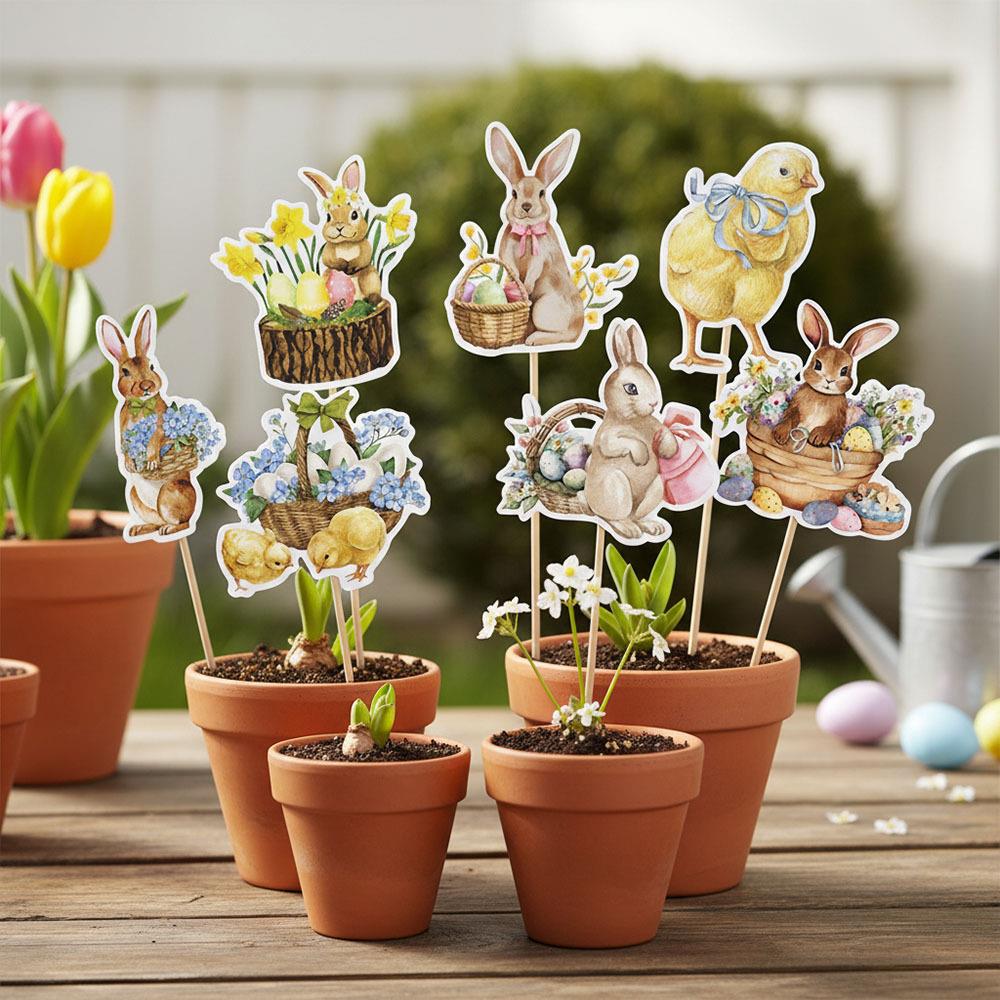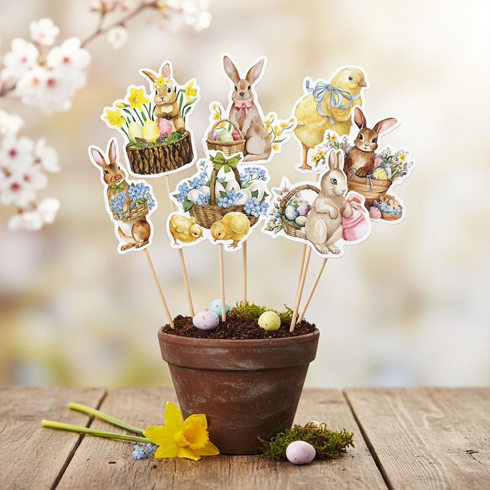 Velikonoční zápichy jsou jednoduchým způsobem, jak oživit jarní výzdobu interiéru. Roztomilé motivy králíčků a kuřátek vnesou do prostoru radost, barvy a velikonoční atmosféru. Skvěle vyniknou v květináčích, truhlících, jarních aranžmá i jako součást slavnostní dekorace.Zápichy jsou lehké, zároveň však dostatečně pevné, aby dobře držely tvar a bylo možné je používat opakovaně. Ideální doplněk pro domácí dekorování i jarní sváteční stůl.