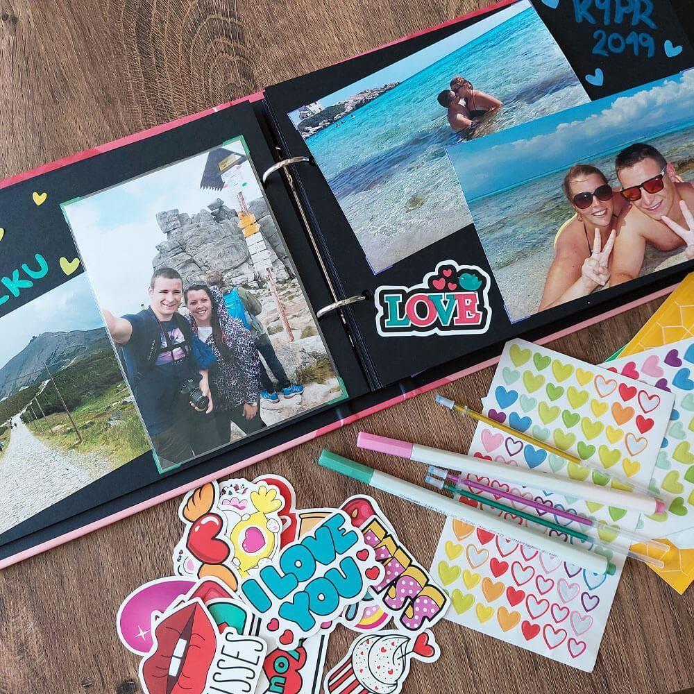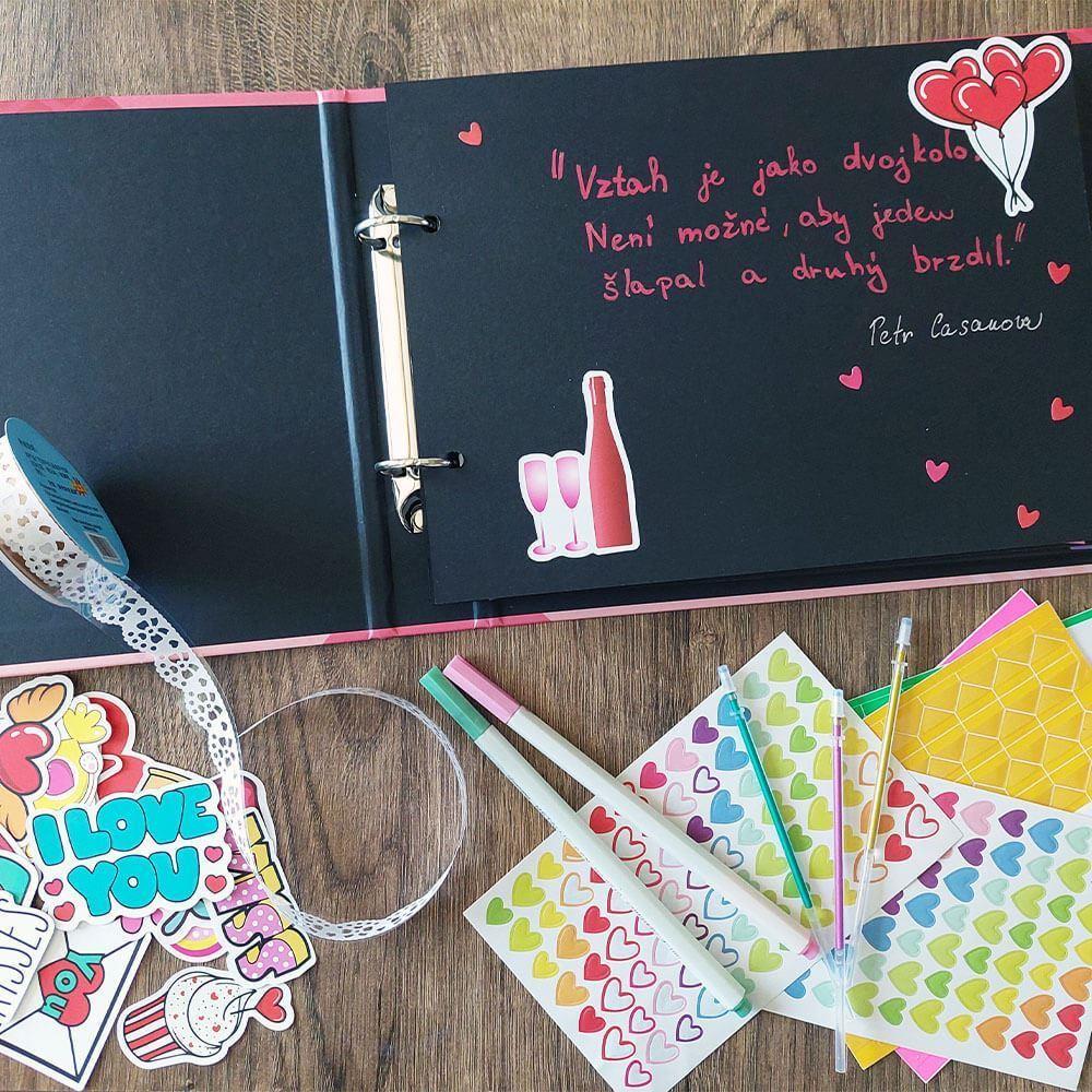 Kreativní album, do kterého umístíte nejen fotografie! Zážitkový deník pro zamilované nabízí možnost vytvořit si jedinečnou vzpomínkovou knihu. Dovnitř lze nalepit fotografie, pohlednice, vstupenky, letenky, svatební oznámení atp. Poté následuje kreativní část, kdy si deník můžete vyzdobit samolepkami, popsat vzkazy, citáty či třeba pokreslit. Zážitkový deník naplňte těmi nejkrásnějšími vzpomínkami, na které nechcete zapomenout. První rande, první společné bydlení, dovolená a všechny zážitky uchované na jednom místě. Deník je také vhodný využít jako vzpomínku na svatbu či oslavu výročí.Deník má roztomilé růžové pevné desky, které ochrání veškerý obsah. Uvnitř je 30 prázdných černých stran, které čekají, až je naplníte svými zážitky!